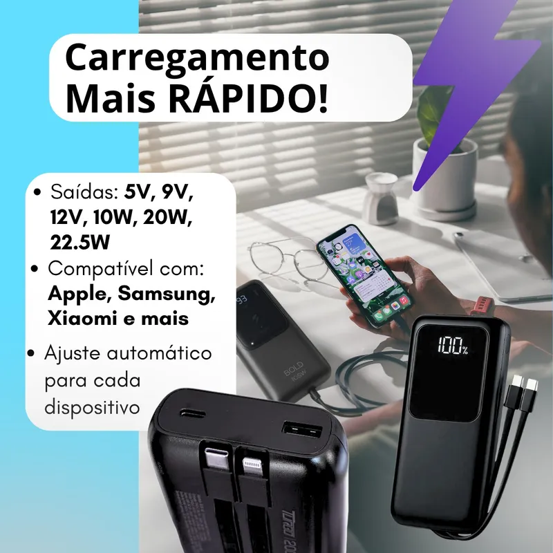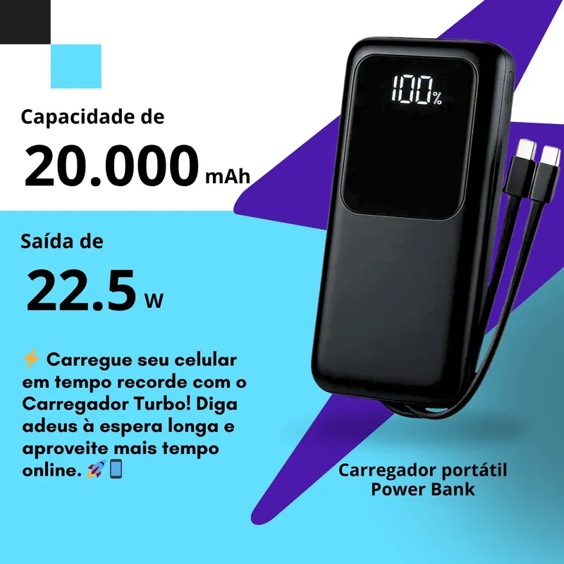 Power bank de alta capacidade 20000mAh com saída Turbo 22.5W, ideal para manter seus dispositivos sempre carregados com rapidez e segurança, onde quer que você esteja.