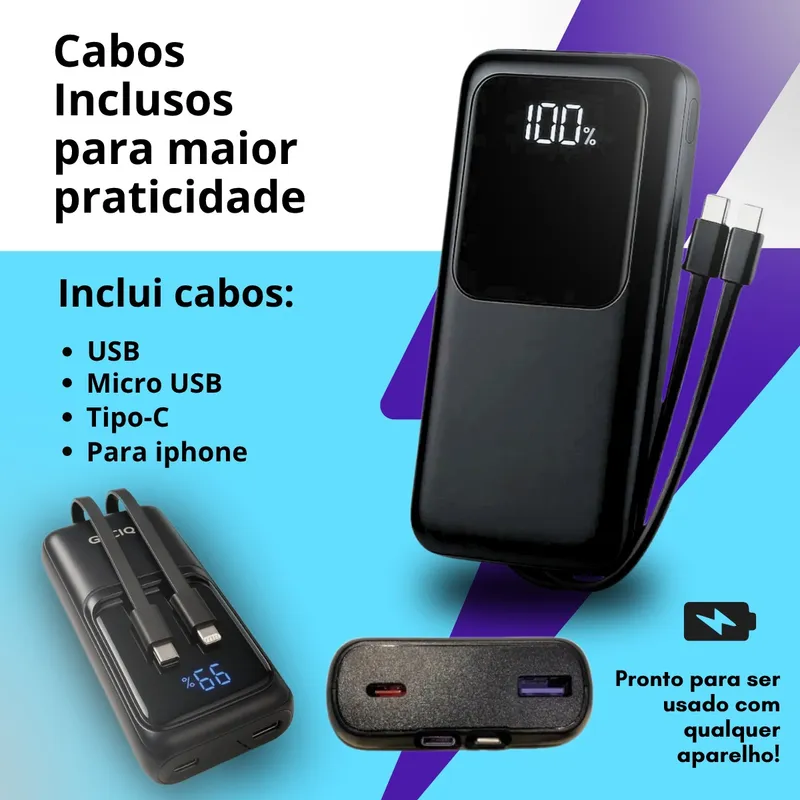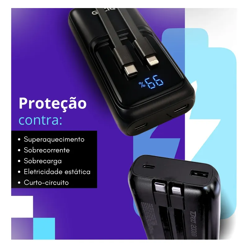 Capacidade: 20000mAh – carga extra para muitos ciclos