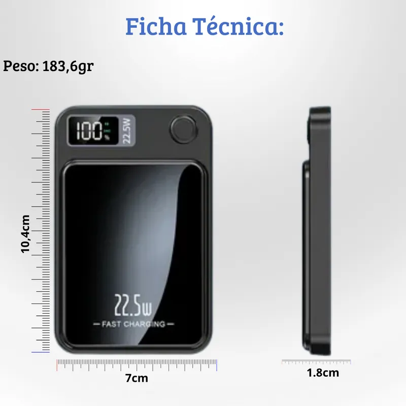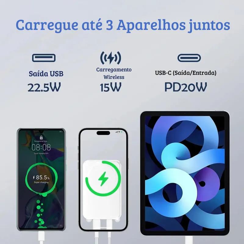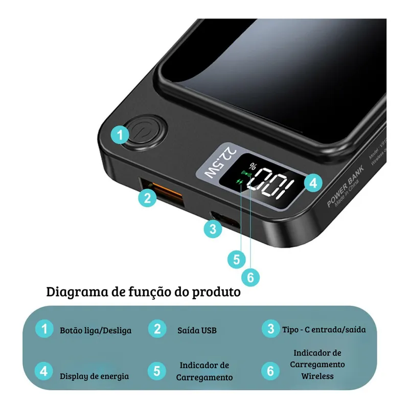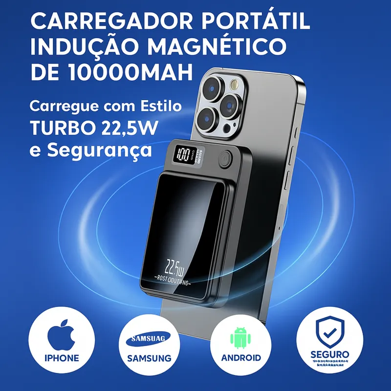 Carregador portátil Power Bank Magsafe 10000mAh com tecnologia de carregamento por indução magnética (Magsafe) e saída Turbo 22.5W — perfeito para manter seus dispositivos sempre com energia, sem fios e com praticidade.