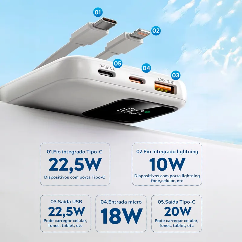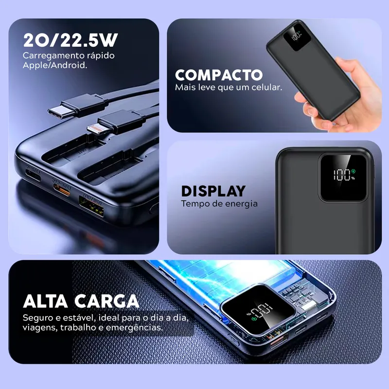 Power bank de alta capacidade com 20000mAh e carregamento rápido 20W Turbo, ideal para manter seus dispositivos sempre carregados com praticidade e segurança.