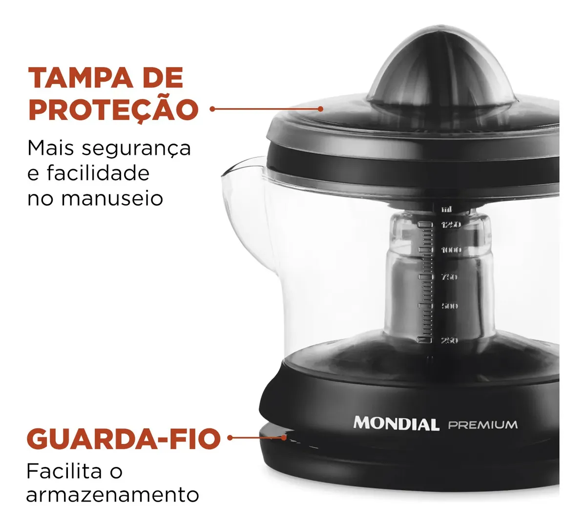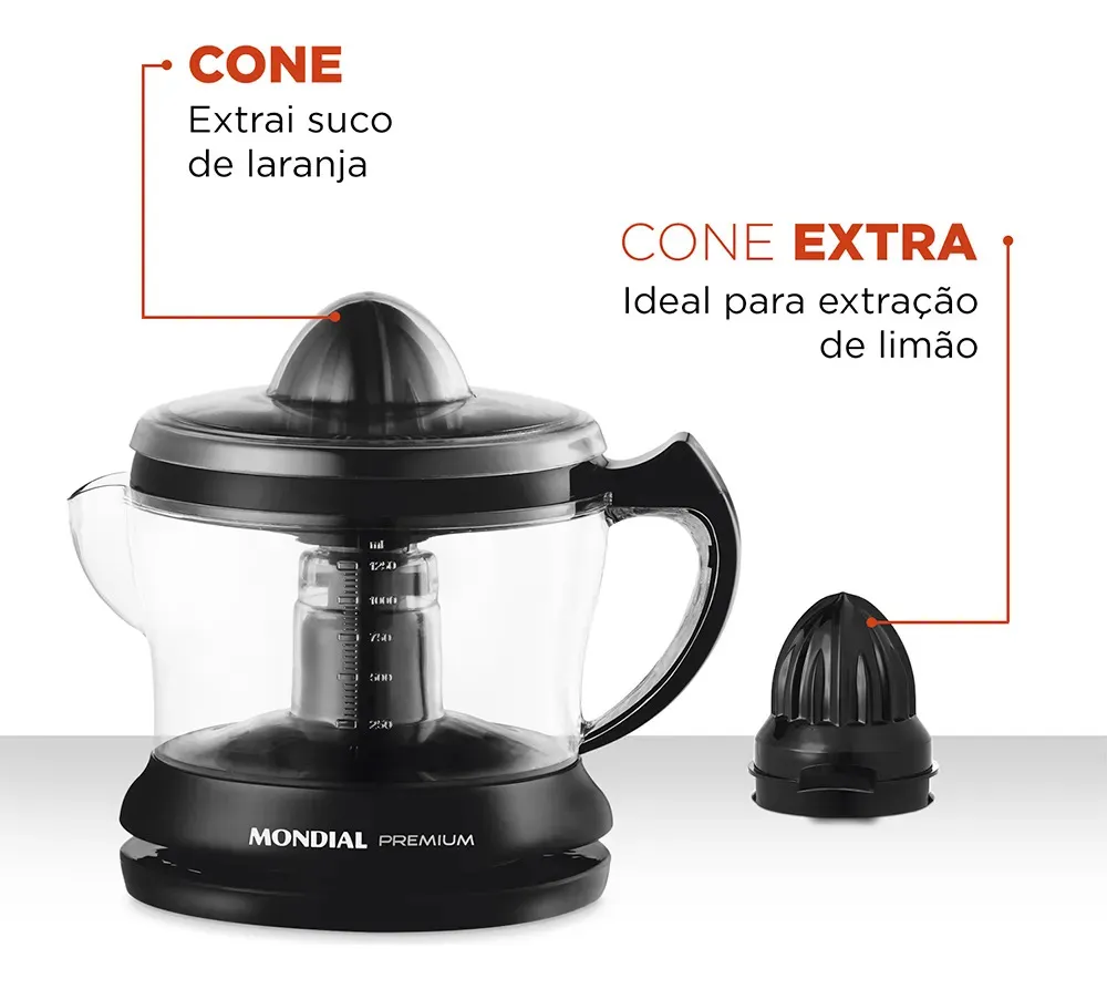 O Espremedor Premium Mondial E-02 é um eletroportátil prático e eficiente para preparar sucos naturais de laranja, limão e outras frutas cítricas. Compacto e fácil de usar, ele possui acionamento automático e jarra com boa capacidade, sendo ideal para o preparo de sucos frescos no dia a dia.